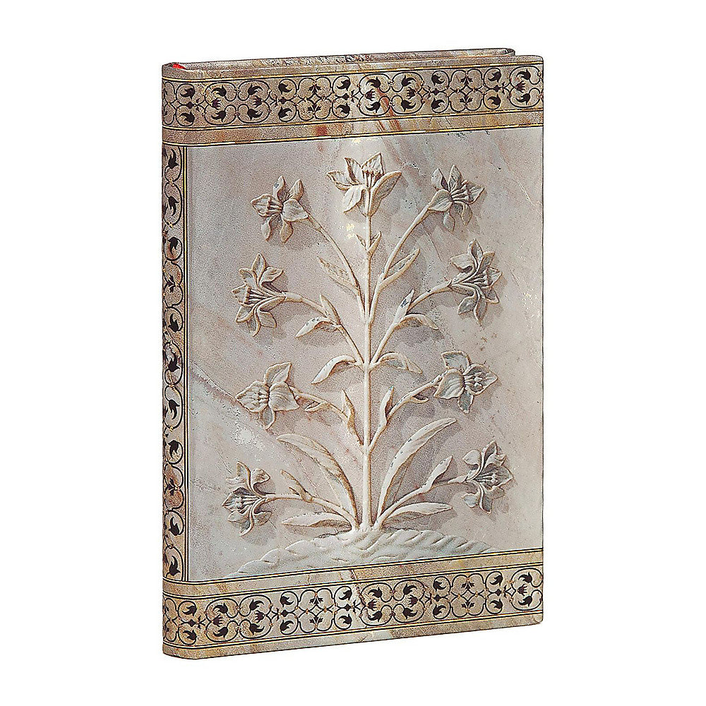 Our Agra journal cover is named for Agra, India, where the Taj Mahal is located. It reproduces a photograph by Gerard Degeorge of one of the Taj Mahal s iconic marble flowers. To carve into marble is to commit to perfection. Any mistake meant the whole slab had to be discarded. Each of these marbled flowers is its own masterwork.