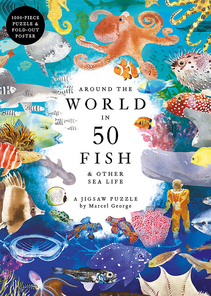 Explore the mesmerizing undersea world with the 1000-piece jigsaw puzzle, 'Around the World in 50 Fish.' This beautifully crafted puzzle transports you to diverse marine habitats, allowing you to piece together 50 extraordinary ocean inhabitants, from lively seahorses to elusive vampire squids. Ideal for ocean lovers and puzzle enthusiasts, this vibrant puzzle features stunningly detailed artwork by talented illustrator Marcel George, whose intricate watercolors bring each marine creature to life. Accompanying the puzzle is a fold-out poster guide authored by renowned marine biologist Dr. Helen Scales, offering fascinating insights into the marine life depicted in the puzzle. Suitable for both adults and children, this captivating jigsaw measures 680 x 485mm when completed, making it a perfect addition to family game nights. Dive into this enchanting puzzle experience, discover the beauty of ocean life, and enjoy hours of engaging entertainment. Whether you’re an experienced puzzler or a beginner, 'Around the World in 50 Fish' promises an educational journey beneath the waves while developing problem-solving skills and providing stress relief. Join us in celebrating the wonders of the ocean with this unique puzzle that combines fun and learning!