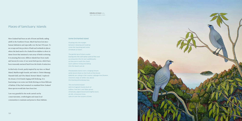 renewal, depicting native New Zealand birds in the landscape as metaphors for
