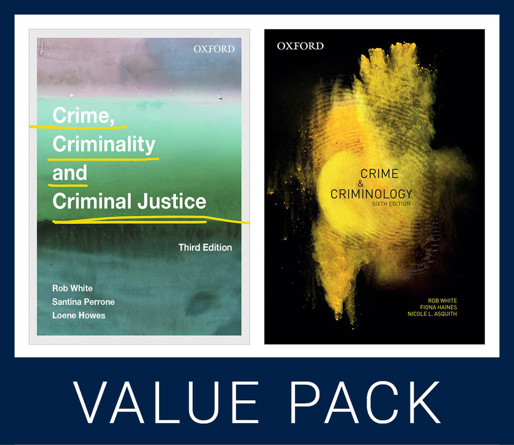 This value pack contains Crime, Criminality and Criminal Justice 3rd edition and Crime & Criminology 6th edition.Crime, Criminality and Criminal Justice is the complete introduction to everything students need to know as they begin their studies in crime and criminology. It explores crime and victimisation in Australian society and introduces the major institutions of criminal justice. It covers core areas including what crime is, types of crime, crime theory, systems and institutions of crime, crime and social inequality, and difference and criminal justice–all within an Australian context. This text will prove to be a valuable reference throughout a criminology degree.Crime & Criminology provides a concise yet comprehensive introduction to the study of crime. The sixth edition explores the key theories that explain criminal behaviour in society, providing students with the opportunity to evaluate how criminologists employ these theories in their analysis of criminological issues. It includes learning features designed to engage students in criminology by demonstrating how criminological theory can be placed in both a historical and contemporary context and how it both frames and draws from research. For more information about these titles, including table of contents, please see their individual pages:Crime, Criminality and Criminal JusticeCrime & Criminology