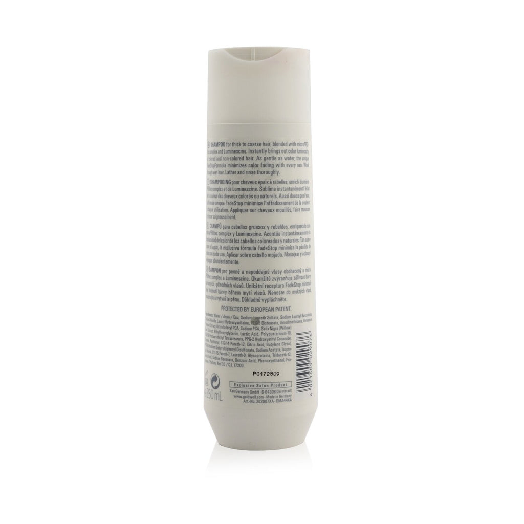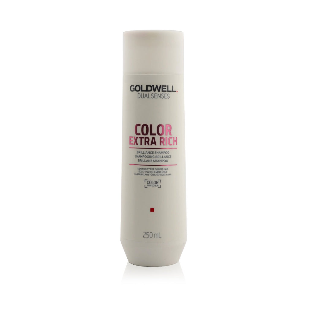 Transform your hair care routine with Goldwell Dual Senses Color Extra Rich Brilliance Shampoo, specially designed for normal to coarse color-treated hair. This luxurious 250ml shampoo gently cleanses while ensuring vibrant, long-lasting color. Infused with the innovative FadeStopFormula, it actively strengthens the anchoring of color molecules, helping to reduce color fading. Experience the power of ColorChromaComplex and nourishing Raspberry Seed Oil, which work together to rejuvenate your hair and keep it healthy-looking. Thanks to Luminescine Technology, this shampoo transforms non-visible UV light into visible light, amplifying your hair's brilliance and vibrancy. Your hair will not only feel refreshed but will also shine with radiant color. Ideal for those seeking to maintain their color-treated mane, Goldwell's formula offers both care and sophistication for coarse hair types. Give your hair the nourishment it craves and preserve your color with this exceptional product. Embrace the beauty of vibrant, healthy hair every day with Goldwell Dual Senses Color Extra Rich Brilliance Shampoo.