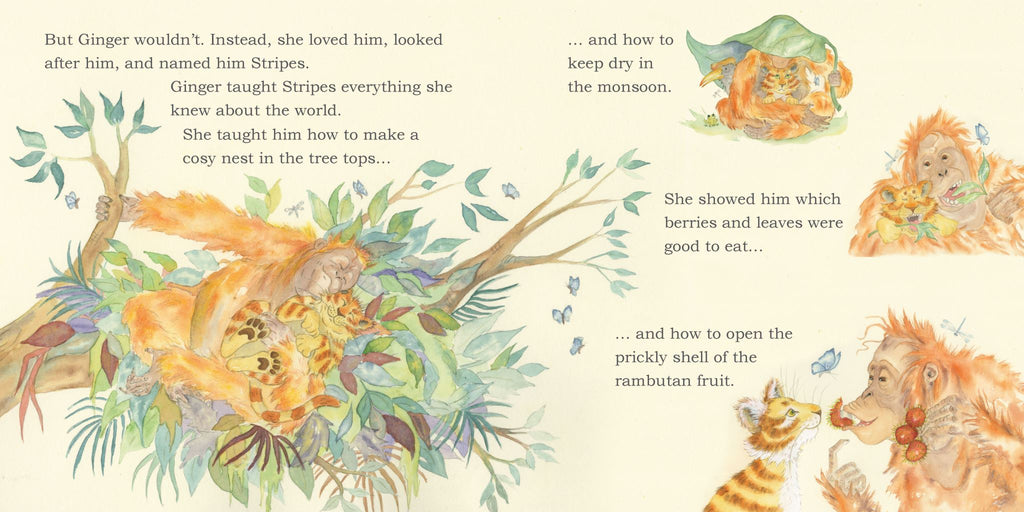 Discovering an orphaned tiger cub at the bottom of the big old rambutan tree, an intelligent and gentle orangutan, named Ginger, rescues him and brings him up as her own child, despite the warnings from the other orangutans about tigers being their natural enemy, and that Ginger would one day become the tiger’s dinner. Ginger teaches the tiger cub all she knows about the world, and how to live like an orangutan. The tiger grows up on a diet of leaves, fruit, honey, insects and bird’s eggs, but he hungers for something more satisfying to eat. When the tiger’s instinct for hunting gradually appears and his appetite for fresh meat becomes too overpowering, the two friends realise that they have to part company, but their deep bond of friendship remains strong and as the years pass by, they never forget about each other.