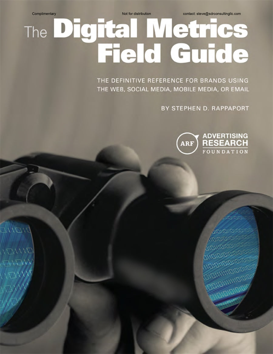 The Digital Metrics Field Guide is the definitive reference for brands of any size that advertise, market or engage with their customers and prospects through email, the Web, mobile or social. Every brand gets performance reports through their providers, which furnish a stunning array of metrics on just about anything that happens on or through the platforms they measure. Yet many brands are unsure about their measurement and want to become more confident. They want to know what metrics are available, what is known about them, how to select them, and how to analyze and report them in ways that help them understand the impact of their digital initiatives. The Digital Metrics Field Guide published in association with the American Advertising Research Foundation, does just that. This unique, comprehensive resource was intended for those of us who use metrics and need straightforward, authoritative, non-technical guidance.