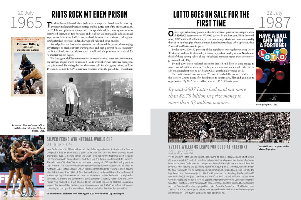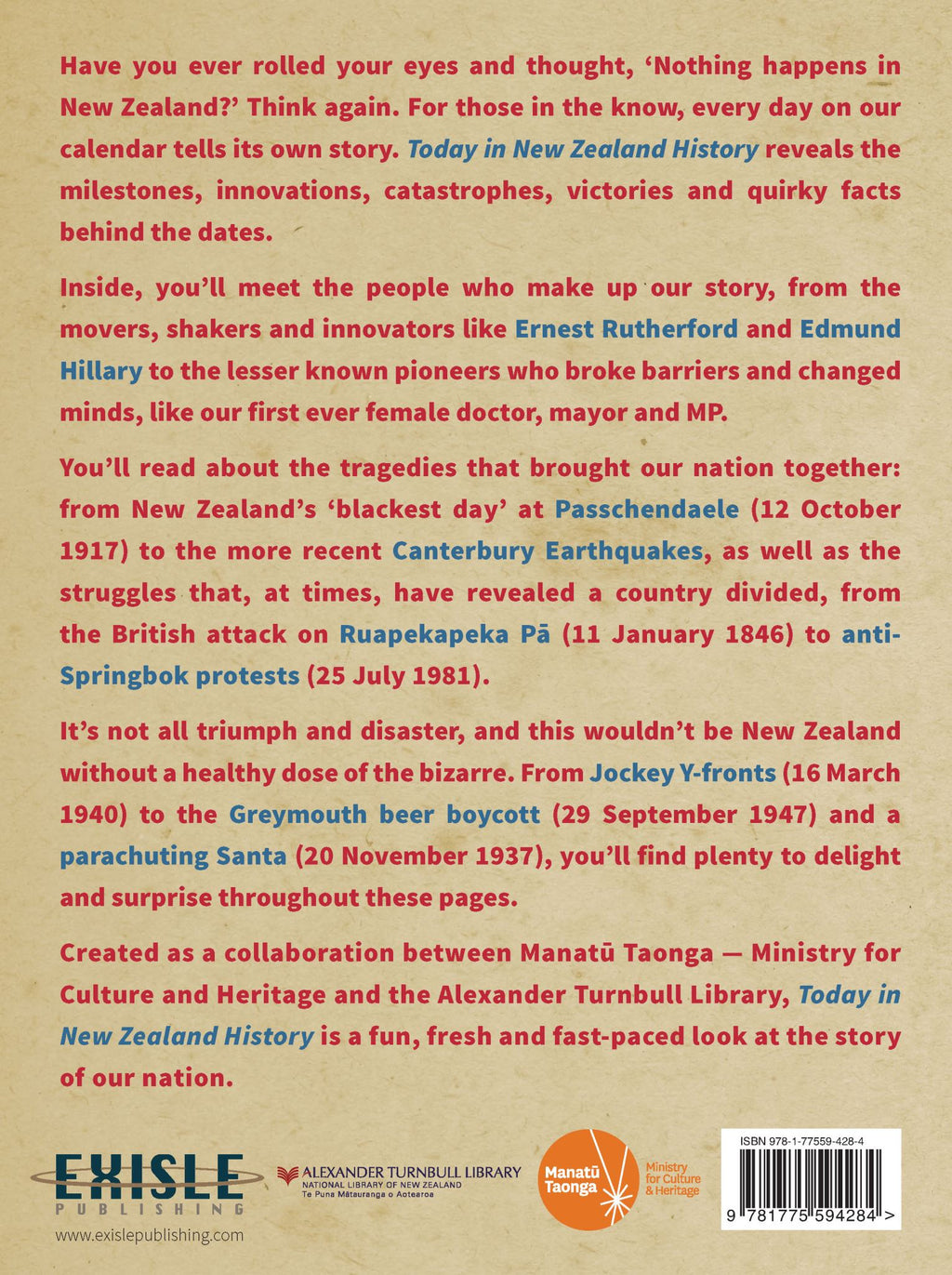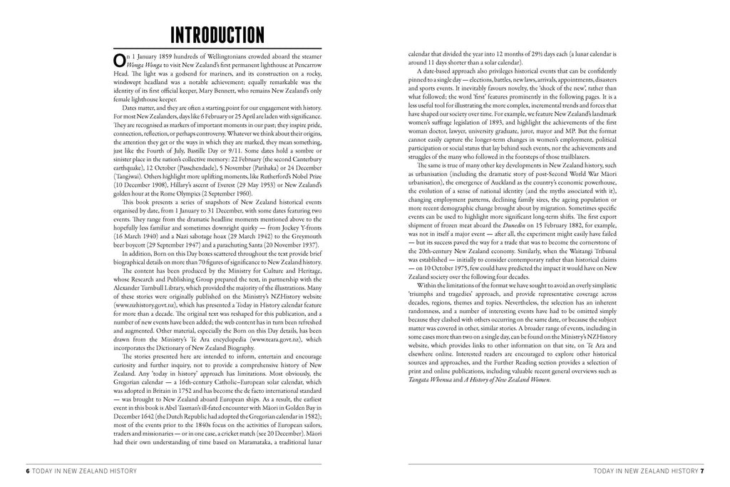 Dates matter, and they are often a starting point for our engagement with history. For most New Zealanders, days like 6 February or 25 April are laden with significance. They are recognised as markers of important moments in our past; they inspire pride, connection, reflection, or perhaps controversy. Some dates hold a sombre or sinister place in the nation’s collective memory: 15 March (the Christchurch mosque attacks), 12 October (Passchendaele) or 24 December (Tangiwai). Others highlight more uplifting moments, like Rutherford’s Nobel Prize (10 December 1908), Hillary’s ascent of Everest (29 May 1953) or New Zealand’s golden hour at the Rome Olympics (2 September 1960). This book presents a series of snapshots of New Zealand historical events organised by date, from 1 January to 31 December. They range from dramatic headline moments to the hopefully less familiar and sometimes downright quirky — from Jockey Y-fronts (16 March 1940) and a Nazi sabotage hoax (29 March 1942) to the Greymouth beer boycott (29 September 1947) and a parachuting Santa (20 November 1937). A timeline lists some of the key moments and events that have helped shape the course of New Zealand’s political and constitutional development, while Born on this Day boxes scattered throughout the text provide brief biographical details on almost 100 figures of significance to New Zealand history, fully updated.