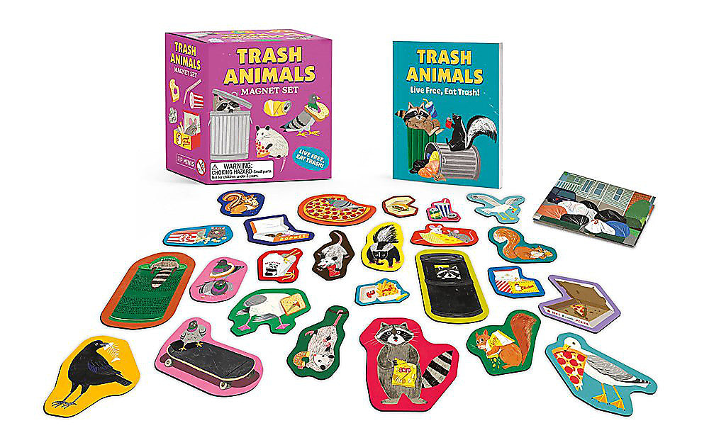 - Interactive Magnet Set: Includes a double-sided illustrated back drop and 25 magnets of raccoons, possums, pigeons, and other cute trash animals to create your own scenes
