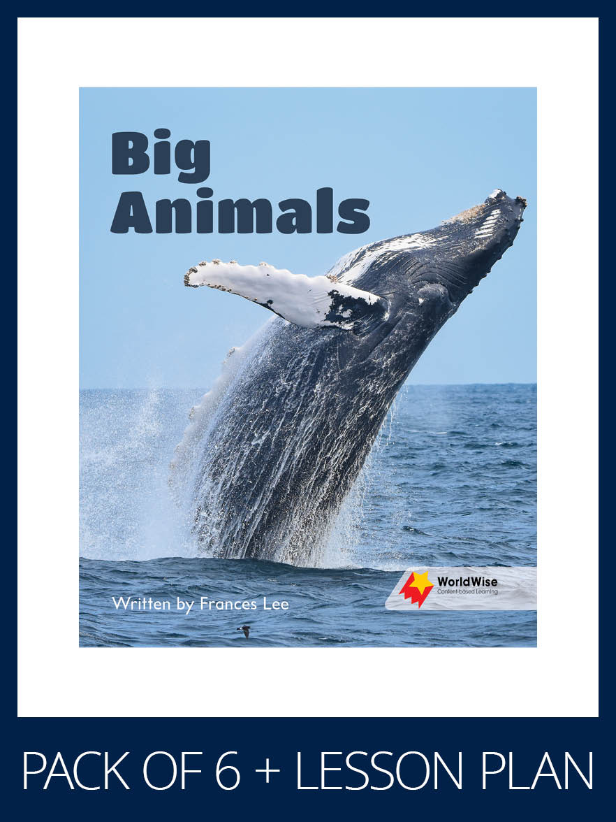 This pack includes six copies of the student book (9781761072109 – as described below) and a lesson plan (9781761072543).Title Information:ÂBig Animals introduces a range of big animals in their natural habitat.Content vocabulary: alligator, bear, elephant, giraffe, lion, octopus, whaleKey concepts: Big animals live in different places. The places big animals live have the things they need to survive.Reading Strategies: Identifying a word as a wordRelated resource: WW LPL1 Big AnimalsSeries Information:WorldWise is a high-interest literacy program that encourages inquiry and questioning while extending knowledge in science and a range of STEM topics linked to the curriculum. This engaging program teaches reading strategies simultaneously with natural, earth and physical science concepts – reflecting the diversity of the world students live in.Students will develop strategies and skills to read informative texts across a range of text types while they learn to become informative text writers. With an assortment of text types on offer, themes and concepts are introduced and revisited across the reading stages, building on initial concepts with increasing complexity.WorldWise Lesson Plans support each Student Book, offering practical, systematic and easy-to-implement instructions. These visually appealing resources integrate oral language, vocabulary development, fluency and comprehension, writing and phonics.WorldWise Investigations is a web-based tool that provides extension activities for titles in the program. It encourages exploration of content linked to curriculum outcomes in a deeper more hands-on way