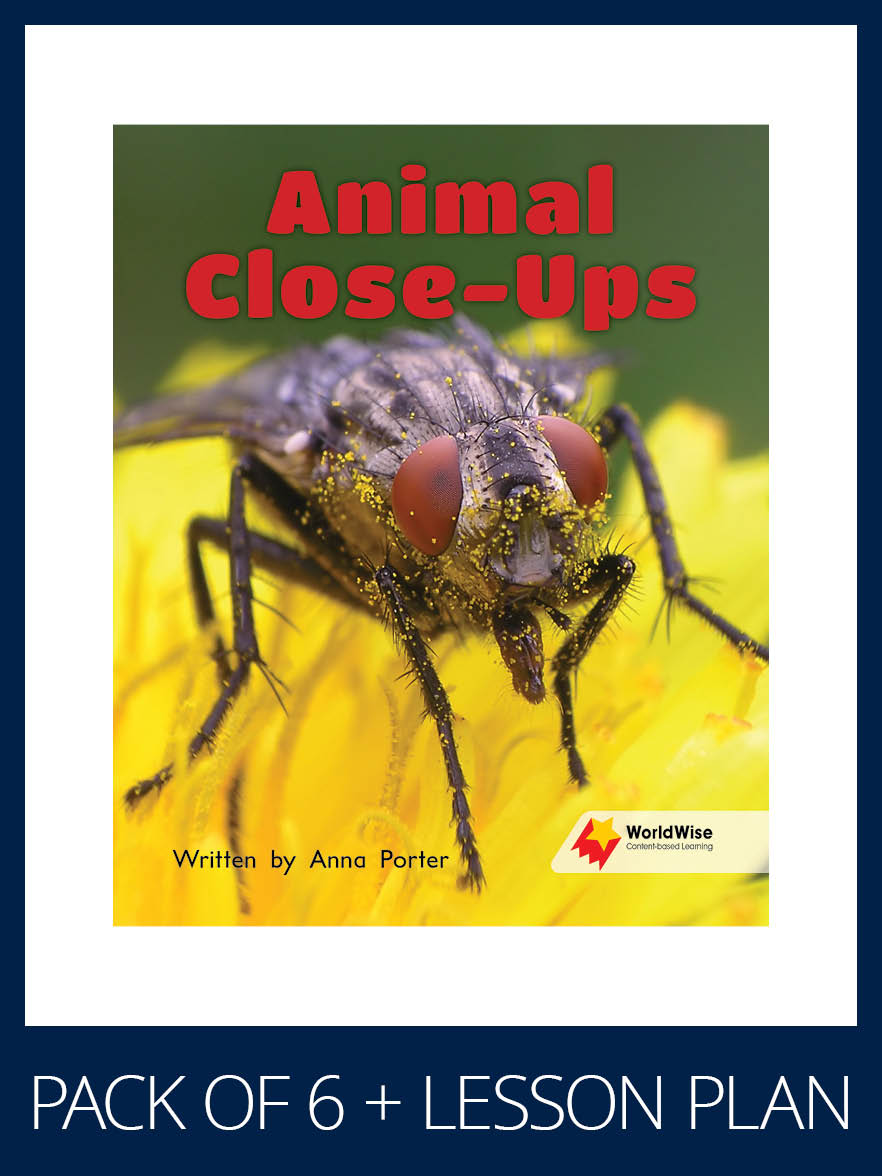 This pack includes six copies of the student book (9781761072383– as described below) and a lesson plan (9781761072826).Title Information:­Animal Close-Ups is a question and answer book that shows magnified photographs of several animal body parts. It describes what each animal uses their particular body part for.Content vocabulary: animals, bull ant, butterfly, eye, fly, food, insects, jaws, moth, mouth, nectar, nest, poison, safe, scorpion, spider, tail, tongue, wingKey concepts:Animals have body parts that help them to do particular things, such as get food and stay safe. Certain body parts help animals to take in information from their environment.Reading Strategies: Linking information in photographs and textRelated resource: WW LPL1 Animal Close-UpsSeries Information:WorldWise is a high-interest literacy program that encourages inquiry and questioning while extending knowledge in science and a range of STEM topics linked to the curriculum. This engaging program teaches reading strategies simultaneously with natural, earth and physical science concepts – reflecting the diversity of the world students live in.Students will develop strategies and skills to read informative texts across a range of text types while they learn to become informative text writers. With an assortment of text types on offer, themes and concepts are introduced and revisited across the reading stages, building on initial concepts with increasing complexity.WorldWise Lesson Plans support each Student Book, offering practical, systematic and easy-to-implement instructions. These visually appealing resources integrate oral language, voc