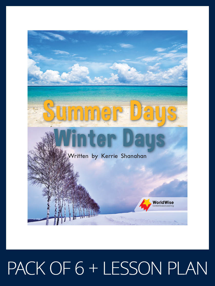 This pack includes six copies of the student book (9781761072413– as described below) and a lesson plan (9781761072857).Title Information:ÂSummer Days, Winter Days describes what can be seen in the sky at different times of the day in both summer and winter. It compares and contrasts these two seasons, and discusses the differences in daylight hours.Content vocabulary: bright, colder, dark, dim, dull, evening, garden, light, midday, morning, rays, sky, summer, sun, sunlight, wake up, winterKey concepts:In summer, the daylight hours last for a longer time than in winter. In winter, we see the sunrise later than in summer. In winter, we see the sunset earlier than in summer.Reading Strategies: Making inferencesRelated resource: WW LPL1 Summer Days, Winter DaysSeries Information:WorldWise is a high-interest literacy program that encourages inquiry and questioning while extending knowledge in science and a range of STEM topics linked to the curriculum. This engaging program teaches reading strategies simultaneously with natural, earth and physical science concepts – reflecting the diversity of the world students live in.Students will develop strategies and skills to read informative texts across a range of text types while they learn to become informative text writers. With an assortment of text types on offer, themes and concepts are introduced and revisited across the reading stages, building on initial concepts with increasing complexity.WorldWise Lesson Plans support each Student Book, offering practical, systematic and easy-to-implement instructions. These visually appealing resources integrate oral language,