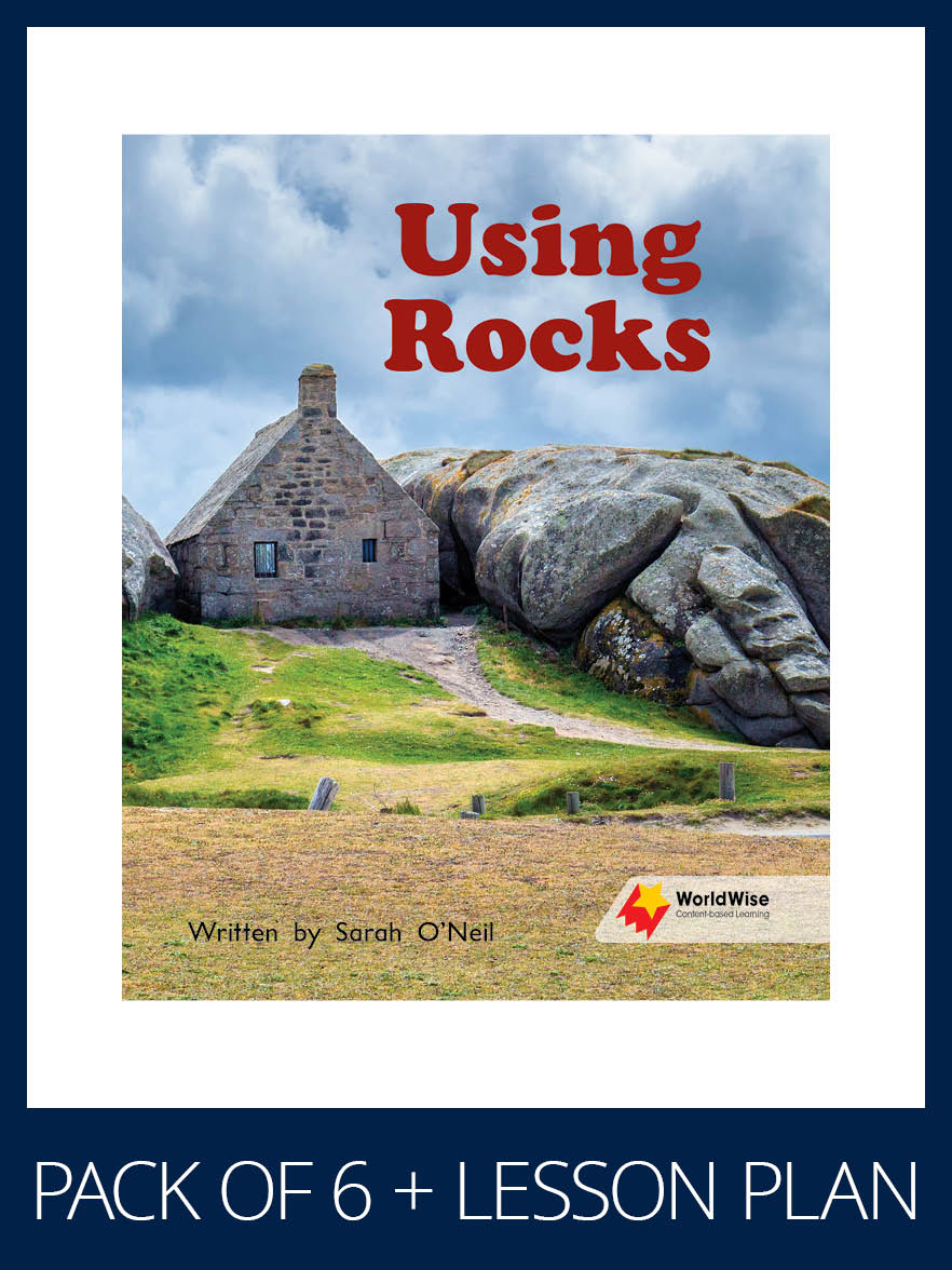 This pack includes six copies of the student book (9781761072239– as described below) and a lesson plan (9781761072673).Title Information:ÂUsing Rocks is a report about the many ways in which rocks are used to build things such as roads, paths, walls, bridges, and houses. It shows two or more examples of each thing rocks are used to make.Content vocabulary: bridge, house/houses, made, path, road, rocks, use, wallKey concepts:Rocks are found in many places in the world. They are strong and hard. People use rocks to build things.Reading Strategies: Using initial letters to solve unknown wordsRelated resource: WW LPL1 Using RocksSeries Information:WorldWise is a high-interest literacy program that encourages inquiry and questioning while extending knowledge in science and a range of STEM topics linked to the curriculum. This engaging program teaches reading strategies simultaneously with natural, earth and physical science concepts – reflecting the diversity of the world students live in.Students will develop strategies and skills to read informative texts across a range of text types while they learn to become informative text writers. With an assortment of text types on offer, themes and concepts are introduced and revisited across the reading stages, building on initial concepts with increasing complexity.WorldWise Lesson Plans support each Student Book, offering practical, systematic and easy-to-implement instructions. These visually appealing resources integrate oral language, vocabulary development, fluency and comprehension, writing and phonics.WorldWise Investigations is a web-based tool that pro