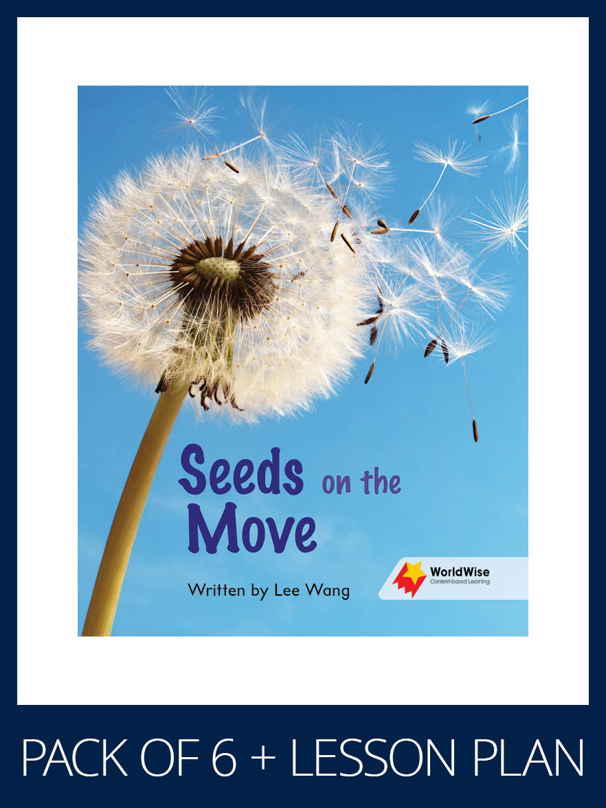 This pack includes six copies of the student book (9781761072307– as described below) and a lesson plan (9781761072741).Title Information:­Seeds on the Move explains how seeds move from the plant they grow on to a new place, so that they can grow into a new plant. It outlines how seeds can be moved by wind, by animals, and by water.Content vocabulary: animal, blows, float, grow, move, plants, seed, stick, water, windKey concepts:Many plants grow from seeds. Different seeds have features that help them to move to a new place to grow. Seeds can be moved by the wind, by animals, and by water.Reading Strategies: Identifying the main ideaRelated resource: WW LPL1 Seeds on the MoveSeries Information:WorldWise is a high-interest literacy program that encourages inquiry and questioning while extending knowledge in science and a range of STEM topics linked to the curriculum. This engaging program teaches reading strategies simultaneously with natural, earth and physical science concepts – reflecting the diversity of the world students live in.Students will develop strategies and skills to read informative texts across a range of text types while they learn to become informative text writers. With an assortment of text types on offer, themes and concepts are introduced and revisited across the reading stages, building on initial concepts with increasing complexity.WorldWise Lesson Plans support each Student Book, offering practical, systematic and easy-to-implement instructions. These visually appealing resources integrate oral language, vocabulary development, fluency and comprehension, writing and phonics.WorldWis