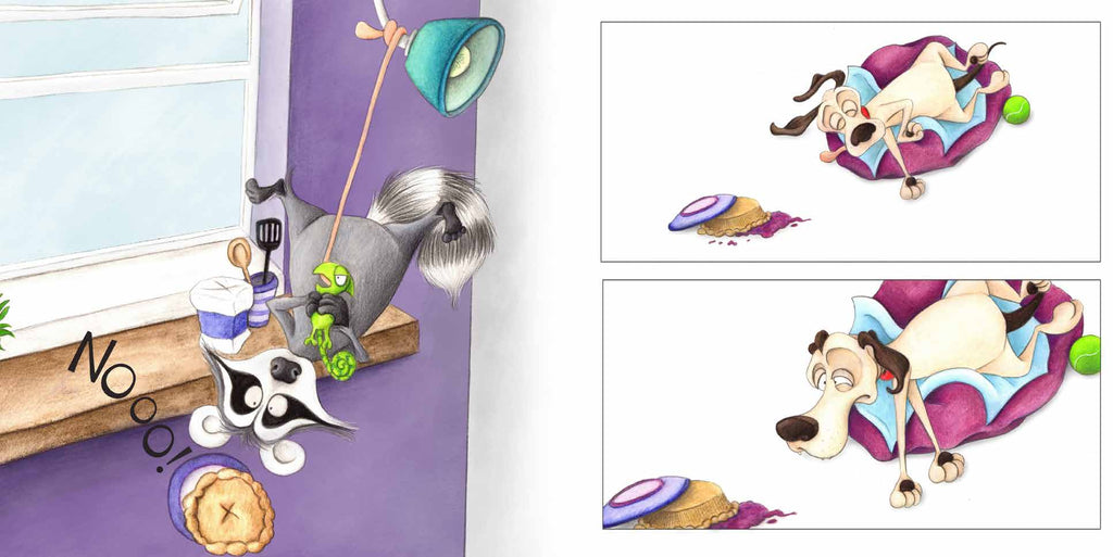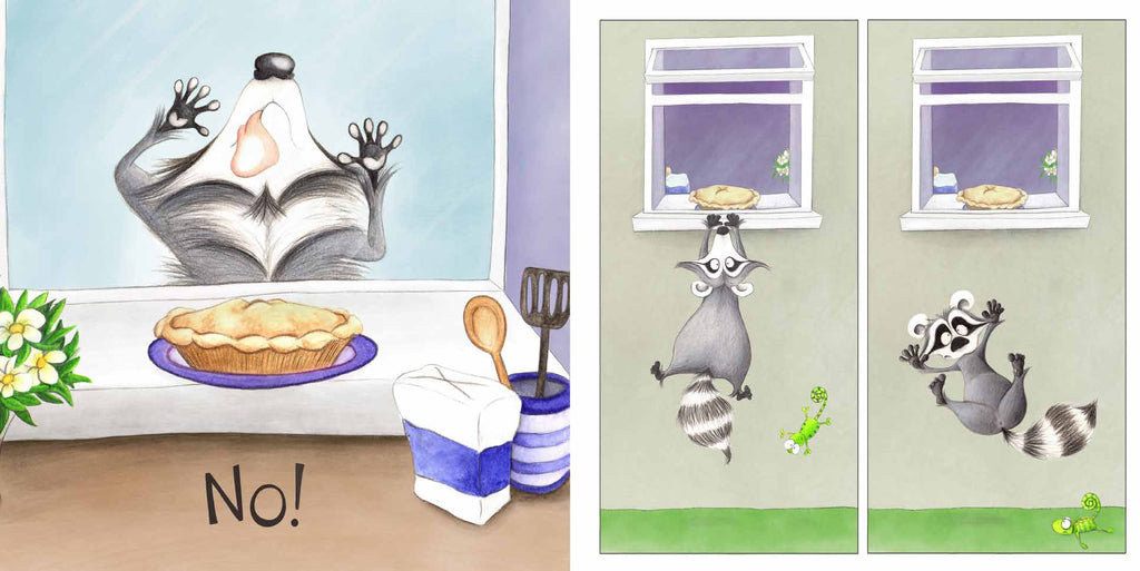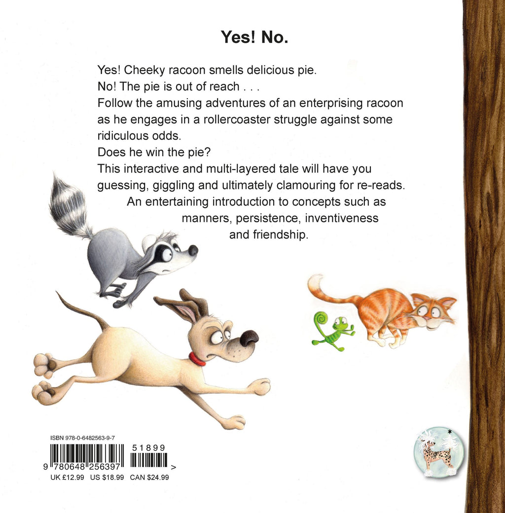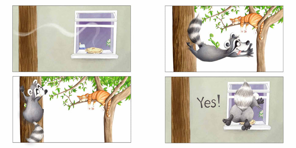 Yes! No. is a fun graphic story for animal lovers. Using just 19 words in total (‘Yes’ and ‘No’ repeated), it tells an action-packed tale about an enterprising raccoon’s efforts to steal freshly baked pie from a home, and the highs and lows which follow as it alternates between winning and losing, and then being thwarted by the home’s domestic pets and small human.
